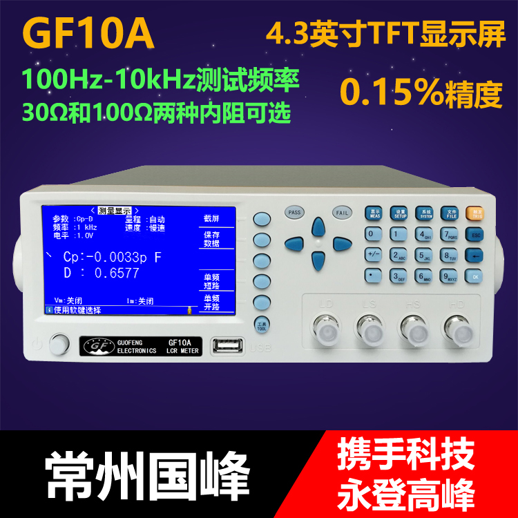 ■ GF10A是一款用于对各种电子元器件进行检验的多功能LCR精密数字电桥。采用4.3英寸TFT LCD显示器,显示简洁、布局典雅。是一种高速、宽频、5位测试分辨率的阻抗测量仪,100Hz-10kHz多频率点以及0.15%的精度可满足各种场合元件参数检测的需求。是一种性价比极高的精品测试仪。