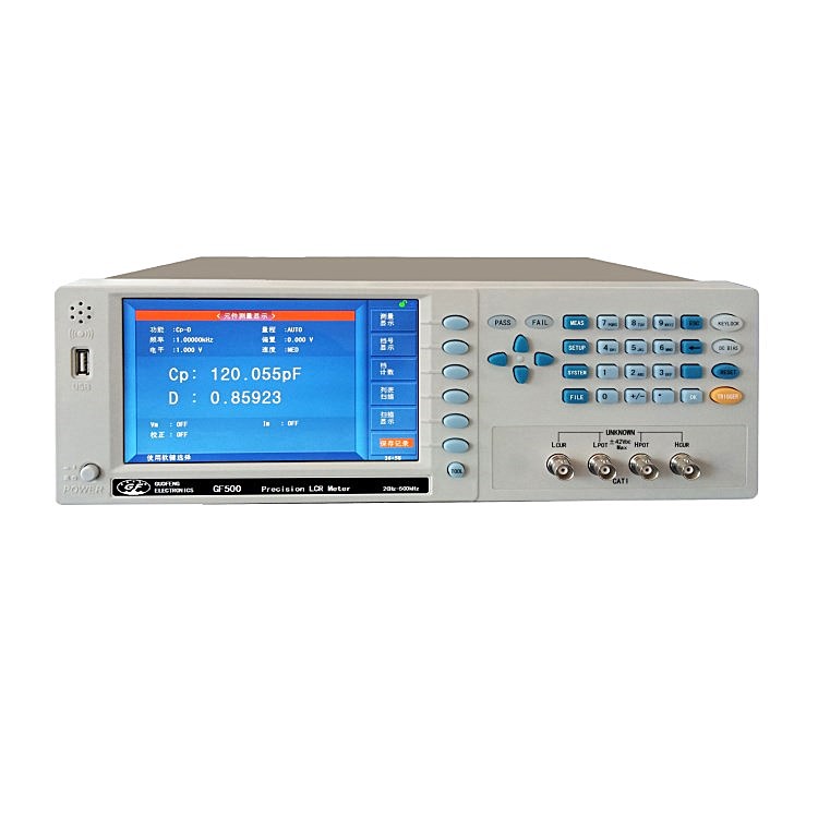 GF500高精密数字电桥是一种用于各种电子元器件检验的多功能元件参数测试仪。采用7英寸800x480彩色TFT LCD显示器。高速、稳定。12Hz-500kHz多频率点以及0.05%的精度可满足生产线品质把控、进货检验及实验室测量等要求。